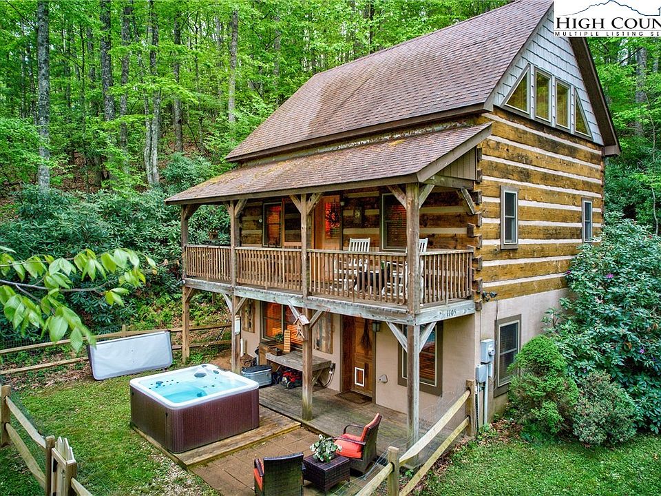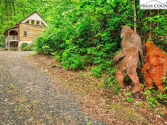 Ideal for second home getaway secluded at the end of this beautiful mountain road. Perfect for outdoor enthusiast seeking mountain getaway. Gorgeous Log Home in Southern Ashe on 4+ pristine acres. You'll love the hand-hewn, Appalachian-style logs. The wonderful scent of wood log interior is ubiquitous. Step outside or open a window and fresh forest fragrance assaults your senses. At night the sound of the tumbling creek below will send you softly into dreamland. Main level has full bath along with kitchen, great room with vaulted ceiling. Above is an open loft, bedroom and half bath. Lower level is finished, open with another sleeping area, half bath with laundry, a small counter, and mini-fridge. If you've had your fill of sweltering southern summers off the mountain, this lovely getaway is just what the doctor ordered. Come get your mountain fix and get away from civilization. 4WD recommended.