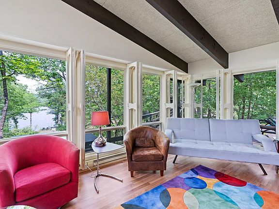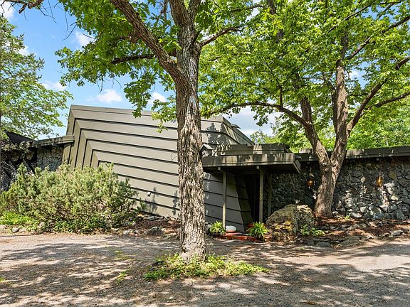 Captivating and magnificent views are awaiting you at this intriguing property. This contemporary home sits just above the St. Croix River with river access. The sublime interiors embrace the naturalistic setting from nearly every room. Floor to ceiling windows and enchanting outdoor spaces perfect for entertaining take on the expansive view of the river. Designed by Arthur Svendsen in the early sixties, this home features 2 spacious bedrooms, 2 bathrooms, Malm fireplace in the primary bedroom, an oversized deck, and screen porch to take in the beautiful scenery. New kitchen flooring, new washer/dryer, updated paint, new driveway provides additional access, and new furnace! This property is part of the Rockpile Neighborhood and each house owns 10% of Rockpile Commons which includes a pond with fountain and surrounding 1.58 acres.
