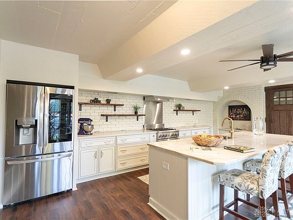 Enchanted English Tudor carriage house sits on almost an acre stunning wooded lot on one of the most sought-after streets in West Oakwood! 3 doors down from the Wright Brothers Hawthorn Hill Mansion, this charming home is nestled down a private drive complete with gentle rolling hills and a 3-tiered pond. This stunning home has been completely updated while maintaining its historic charm. A beautiful two-story entry welcomes you in. The gourmet kitchen features high-end SS appliances, exotic leathered Taj Mahal granite counters, huge, oversized center island with seating. Beautiful antique-stained glass windows add old-world charm to this amazing space. The original carriage doors are now a tiered pantry. The great room is on the upper level and features vaulted ceilings, original wood beams & a large stone fireplace. This large room is perfect for gatherings and relaxation, especially with the flagstone patio right out of the sliding glass doors. The primary bedroom ensuite is amazing! It features Carrera marble flooring and wall tile along with a custom 2-person shower with a beautiful glass door. The 2-bowl vanity is from Restoration Hardware and has a Carrera top as well. Don't forget the private deck/balcony off the primary bedroom with a spiral-iron staircase. Beautiful details such as a turret are reminiscent of the English Tudor architecture. There is charm galore throughout this special home. Very, very close proximity to both schools!