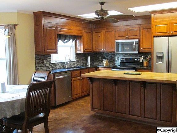 - KITCHEN DESC: Crown Mold, Smooth Ceiling, Ceiling Fan, Granite Countertop, Wood Floor, Kitchen Island, Bay WDW, Fireplace