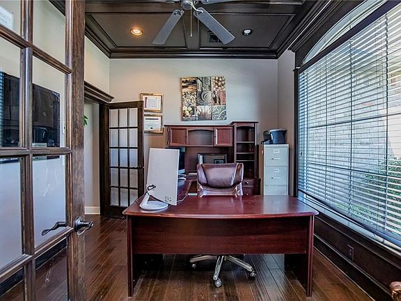floor plan on lower level with beautiful dark hardwood floors throughout the common areas. Custom stone FP surround & built-ins with lots of windows. Living Room opens onto covered deck & access to fenced backyard with raised garden. Formal dining room and a large executive office with coffered ceiling on the front of the house. Owner's Suite is massive and gorgeous w/huge Bath w/walk-in shower and jetted tub, custom built-ins in large his and hers walk-in closets. Massive bonus/theatre room with an area also useable as a 5th bedroom. Freshly painted kitchen cabinets. Many custom touches including central vac, under cabinet lighting, pot-filler, double oven, drawer microwave and that you can't get in new spec houses of this price. Neighborhood Pool, Tennis, Basketball & More! Close to everything! One-owner home