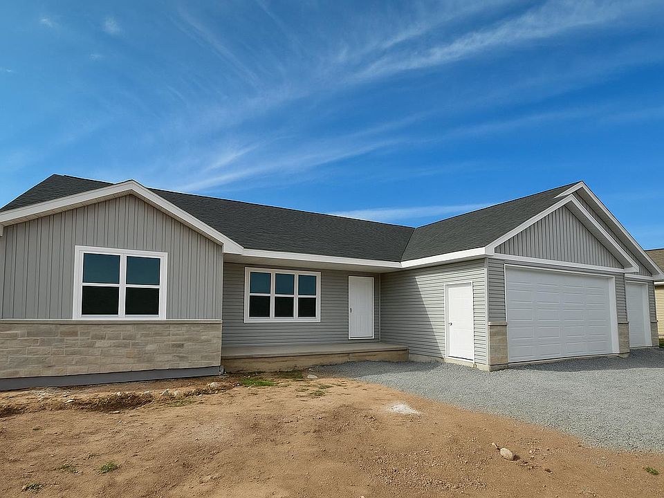 This new 1,497 sq. ft. home by Riverwood Homes features a popular floor plan with 3 bedrooms and 2 bathrooms, an open layout filled with natural light, and pond views. Inside you’ll find custom cabinets, solid doors, wood trim, upgraded lighting, and a cozy fireplace. Extras include wood closet shelving, a 12x12 patio, full driveway, and an active radon system. The basement is set up for a future bath and bedroom with an egress window. Curb and gutter already installed! A great mix of style and value—plus a location close to schools. Pictures are of similar home, estimated completion of mid-October.