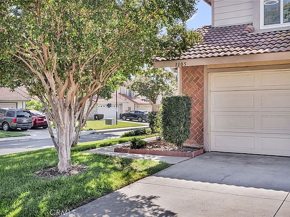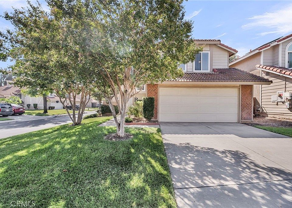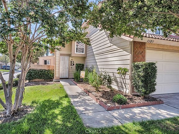 This upgraded home in Andover Square Community of Rialto is Move in Ready. The corner lot location with no adjacent rear neighbors provides additional privacy. Upon arrival the beautiful herringbone brick accents along with the lush landscaping will welcome you in. The living room has cathedral ceilings, a cozy fireplace and an abundance of natural lights that cascades throughout the room from the multiple windows. There is a formal dining alcove or currently used as the piano area adjacent to the living room. The kitchen has been remodeled with stainless steel appliances, upgraded warm cherry stain cabinets and stone counter tops. The dining area that is connected to the kitchen is spacious and looks out onto the rear patio. The laundry area is conveniently located near the kitchen and downstair bathroom. Upstairs there are 2 large additional bedrooms, a full bathroom and the primary suite. The primary suite is located towards the rear of the home adding to its privacy. The primary has 2 closets and its own private bathroom; this is the perfect sanctuary you have been searching for. The decorator paint colors and upgraded flooring add to the overall modern feel this home offers. Along with the decorator touches, remodeled kitchen and baths the upgrades also include a newer HVAC. The rear yard has a covered patio, artificial turf and has been thoughtfully designed for low maitenance and entertaining in mind. The shed is completely finished with drywall on the interior and has electrical outlets and lights, making it a perfect art studio or office space. This wonderful neighborhood offers 2 pools, sport courts, walking paths and plenty of green space, it feels like a resort. This home has solar along with low taxes adding to its overall affordability. Located near schools, shopping, restaurants and easy access to freeways for commuters.
