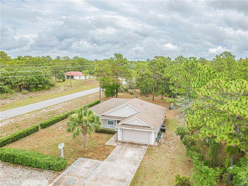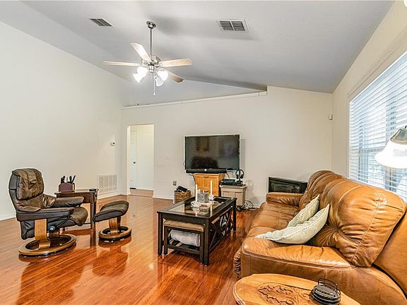 You will love the open floor plan of this HOME. 4 Bedrooms 2 bathrooms 2 car garage on .61 acres. Once you walk into this home you will notice the hardwood floors through the home. The kitchen is great in size with lots of cabinetry space and a breakfast bar. Inside laundry just off the kitchen. The wood floors continue throughout all the bedrooms. Take notice of Cathedral ceilings. The master bedroom is great in size with a large master bath and a very large walk-in closet. The open floor plan gives direct site line access to the open living room and dining room, great for parties and get together with family and friends. Head outback to, not one, but 2 porches with the main porch being covered and screen enclosed. Exterior of the home was just painted. NO HOA and no cdd. PLENTY of parking, so bring your RV. Schedule today to see this home!