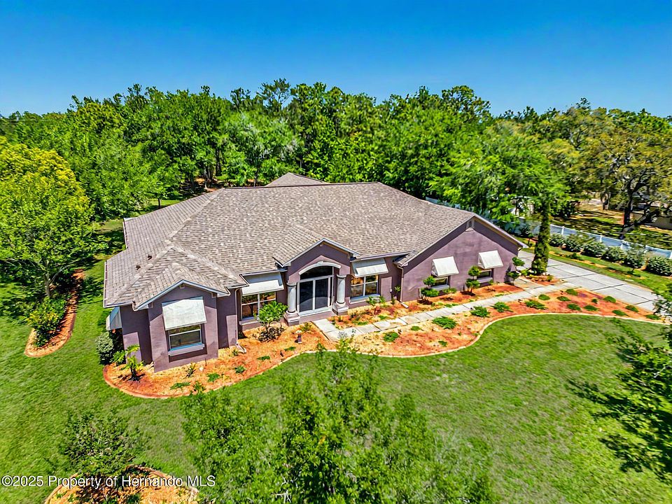 SPACIOUS 3-BEDROOM + OFFICE CUSTOM HOME ON 1 ACRE - HUGE LANAI, OVERSIZED GARAGE, NO HOA! Welcome to 11053 Frigate Bird Ave—the dream home you've been searching for! This beautifully designed 3-BEDROOM + OFFICE, 2-BATHROOM HOME offers 2,759 SQUARE FEET OF LIVING SPACE and 4,364 SQUARE FEET UNDER ROOF, all nestled at the end of a PEACEFUL CUL-DE-SAC on a FULL ACRE LOT in Weeki Wachee. Built in 2005 BY PASTORE CUSTOM BUILDERS, this home was designed with everyday living in mind. Inside, you'll find FORMAL LIVING AND DINING ROOMS, plus a MASSIVE FAMILY ROOM with a cozy GAS FIREPLACE that flows seamlessly into the heart of the home—an expansive KITCHEN featuring a BUTLER'S PANTRY that's perfect for a coffee bar, wet bar, or extra storage. The sunny BREAKFAST NOOK with a MITERED GLASS WINDOW offers beautiful backyard views! The SPLIT FLOOR PLAN gives the PRIMARY SUITE maximum privacy, featuring HIS & HERS CLOSETS, lanai access, and a spa-like PRIMARY BATHROOM with a GARDEN TUB and WALK-IN SHOWER. A dedicated HOME OFFICE sits just outside the primary suite, perfect for remote work or a private study space. On the opposite side, you'll find two OVERSIZED GUEST BEDROOMS, a BUILT-IN WORKSTATION AREA, a full GUEST BATH, and a large LAUNDRY ROOM with utility sink and cabinetry. Let's talk about highlights—because this home has some big ones! The 30' X 24' SIDE-ENTRY GARAGE offers plenty of space for oversized vehicles, golf carts, motorcycles, or all your toys. Out back, the SCREEN-ENCLOSED LANAI also measures 30' X 24', providing a massive outdoor space ready for relaxing, entertaining, or creating your dream backyard retreat. Additional features include a STORAGE SHED, WELL HOUSE, LANDSCAPE CURBING, SPRINKLER SYSTEM, WATER SOFTENER, PARTIAL HURRICANE SHUTTERS, and the peace of mind of NO HOA, NO CDD FEES, and PAVED ROAD ACCESS! Major updates already completed: NEW ROOF (January 2024),