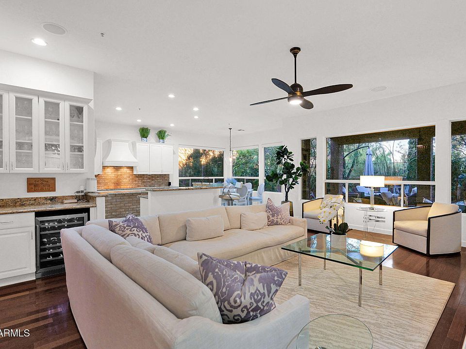Nestled on the largest lot in Echo Ridge in Troon North, this beautifully updated home is the largest in the subdivision, and features a welcoming open-concept design with four bedrooms plus a den/office, with the primary suite on the main floor. Positioned on a bend, the home enjoys added privacy with no direct views of neighbors. Upon entering thru custom 10' antique doors, you're greeted by bright, inviting living space with updated floors through most areas. The family room has a striking marble fireplace, creating a cozy atmosphere that opens to the fully renovated, chef-inspired kitchen with updated counters, cabinetry, and appliances—perfect for entertaining. Outside, the tranquil backyard w/ water feature offers an idyllic retreat. A 3-car garage w/ built-ins completes the home.