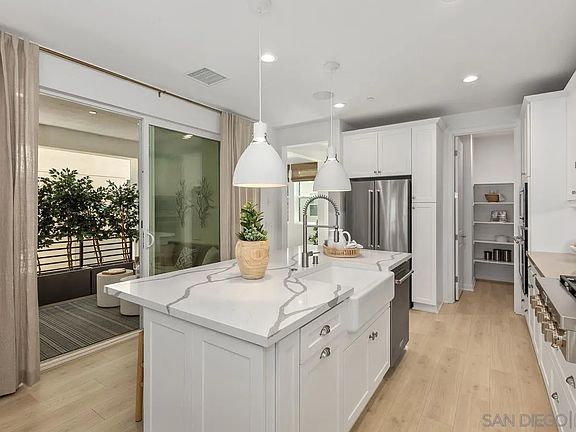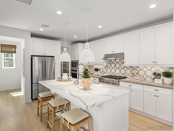 Welcome to the highly sought-after 3 Roots Community of Sorrento Mesa. This stunning new construction model home has been exquisitely upgraded to the highest level, showcasing modern architecture and luxurious finishes at every turn, and is being sold fully furnished! A magnificent fountain in the courtyard welcomes you as you enter the property, the first floor also has a secluded bedroom retreat with an ensuite bathroom. This home is flooded with abundant light and boasts 9' ceilings, 3 bedrooms, 3.5 bathrooms, an office and so much more. The open plan main floor features a contemporary kitchen, with white shaker cabinetry, quartz countertops and stainless steel appliances. Adjacent to the kitchen are the dining room and living room, with a wall mounted 65" TV, a large private balcony, with an office and powder room to complete the floor. The staircase leads you to the large light-filled primary and secondary bedrooms with ensuite bathrooms, and a full laundry room. There is a 2 car attached garage, solar system, easy access to the walking trails of the canyon, and all the amenities of 3 roots at your doorstep. This home is fully loaded with upgrades, and truly move-in ready. The epitome of wellness and convenience at the 3Roots Community, residents enjoy a plethora of amenities designed to promote a balanced lifestyle and foster community engagement. Explore the tranquil beauty at the three meticulously curated parks, clubhouse, gym and pool. Sorrento Mesa is conveniently located minutes to Sorrento Valley & La Jolla Tech companies, freeways, La Jolla Beaches, Do