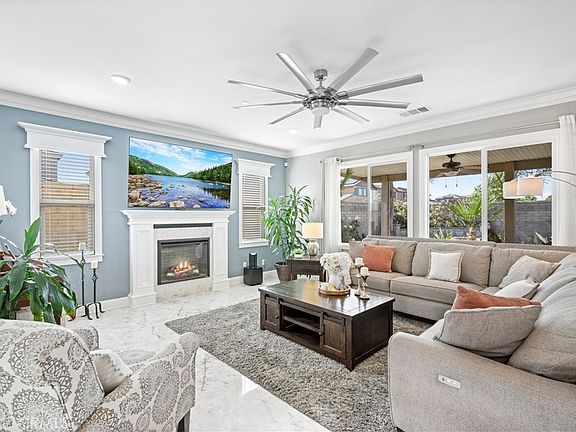 This beautifully upgraded 4-bedroom, 3-bathroom home includes a desirable downstairs bedroom and full bath, plus a spacious upstairs loft perfect for a second living area or office. Enter to an open floorplan featuring a gourmet kitchen with quartz countertops, Bosch cooktop, built-in oven and microwave combo, upgraded pantry, Kraus sink and premium faucets. The home showcases elegant details throughout, including white marble flooring, decorative wainscoting, crown molding, designer chandeliers, and a custom electric fireplace. The backyard is an entertainer’s dream, complete with stone landscaping and a cozy fire pit—ideal for relaxing evenings.