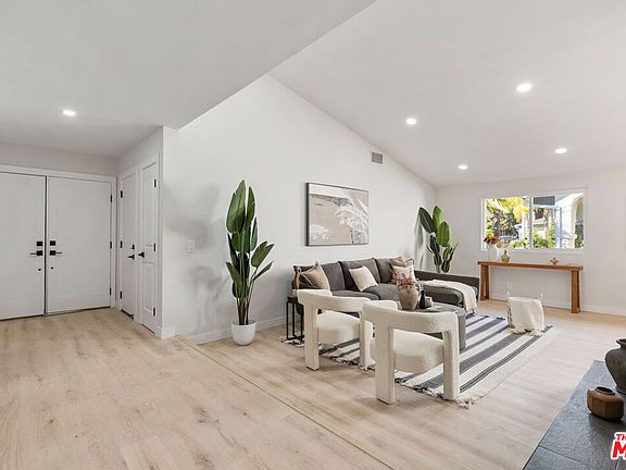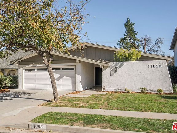 Nestled in a sought-after Granada Hills enclave on a cul-de-sac, this beautifully updated charmer boasts striking curb appeal with its crisp white stucco exterior, taupe trim, and angular roofline. A beautiful walkway leads to the modern double-door entrance hallway, setting the stage for the stylish interiors within. Inside, soaring vaulted ceilings, recessed lighting, laminate wood floors, and large windows flood the open-concept living room with natural light, complementing the eye-catching white brick fireplace as a statement centerpiece. The elevated dining area features a sophisticated Black Wagon Wheel Chandelier, adding farmhouse charm and industrial elegance. The family room, overlooking the serene backyard and pool, flows seamlessly into the chef's kitchen; a masterpiece of design showcasing white shaker cabinets, Calacatta quartz countertops, and a Fresno Argos Ceramic Tile backsplash. High-end stainless-steel appliances and a large picture window provide stunning views of the tranquil backyard and pool. The spacious primary suite offers a peaceful retreat with a walk-in closet and an en-suite bathroom designed for luxury. Highlights include Candler Gray Matte Porcelain Tile flooring, a Satin White Hexagon shower pan, and a stunning vanity with a white engineered stone top. Two additional bedrooms feature large windows, mirrored closets, and ceiling fans for year-round comfort. The hallway bathroom is equally impressive, featuring matte porcelain tile floors, a beautiful vanity with a white engineered stone top, and a porcelain tile shower surround with modern black hardware. Step outside to a private backyard oasis featuring a large sparkling pool and an expansive concrete deck. A brick-paved patio seamlessly extends from the home, offering the perfect setting for entertaining or relaxation. Surrounded by lush landscaping and mature trees, this outdoor retreat provides both beauty and privacy. This is a MUST SEE!