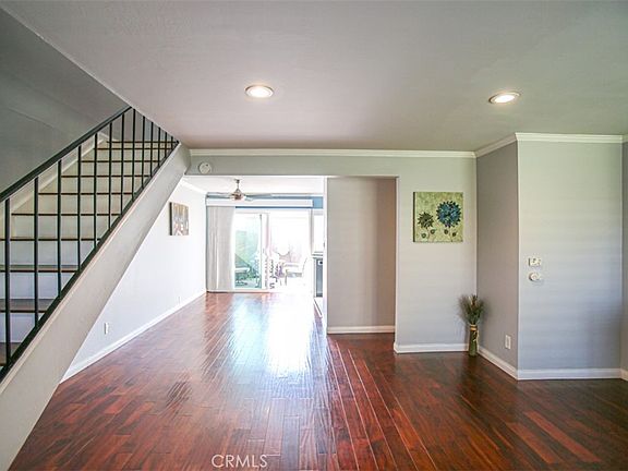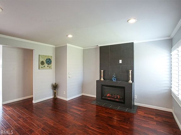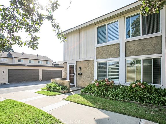 Turnkey Corner unit! Bradford place community Townhome, 3 bedrooms, 1.5 bathrooms, detached 2 car garage. Inside featuring laminate wood floors, plantation shutters, recessed lighting, built in electric fireplace, upgraded dual pane windows. First floor features a half bath, dining area, and remodeled kitchen. Sliding door access to spacious back patio area. All 3 bedrooms upstairs, remodeled bathroom, laminated wood floors. The Bradford Place community offers resort-style amenities, including a sparkling association pool, inviting clubhouse, and a fun-filled kids' playground. Best of all, enjoy the peace of mind and educational excellence of the award-winning Garden Grove Unified School District.