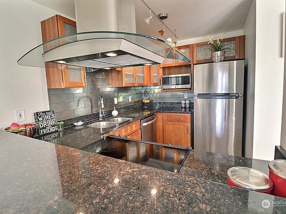 Welcome to your cozy retreat in the heart of Bellevue! This 1-bedroom condo boasts an open concept Great Room with a fireplace, creating a warm and inviting atmosphere. The great little chef's kitchen features new appliances, offering convenience and style. New Blinds Abound. Conveniently located near 520, commuting is a breeze. Nestled against the picturesque Eastrail Walking and Bike Trail, Enjoy Nature right outside your door. With a great location, privacy, and low HOA, this condo is the perfect Urban Oasis, with the added bonus of a main level with no stairs. Welcome Home.