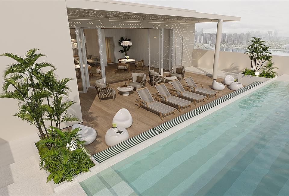 One or more photo(s) has been virtually staged. Pre-Construction. To be built. The Nautilus experience begins with a luminous entrance, where manicured landscaping highlights a carefully preserved original banyan tree. The Nautilus is an exclusive collection of 13 condominium residences, where innovative design, craftsmanship, and artistic expression blend seamlessly with natural beauty. Designed for those who love to entertain, the living room seamlessly extends to the expansive terrace, forging a connection between the refined interiors and the surrounding cityscape. An abundance of natural light floods the room through floor-to-ceiling Miami-Dade hurricane proof windows, accentuating the exquisite finishes chosen for their elegance and durability. The windowed kitchen and butler’s pantry feature custom-designed cabinetry, adding warmth and refinement while providing ample functional storage. Outfitted with premium Miele appliances and a Sub-Zero refrigerator, the kitchen effortlessly transitions into the dining room via an extra-wide floating island bar—ideal for entertaining guests in a luxurious yet practical setting. With generous proportions and a flexible layout, the study seamlessly balances style and functionality. The expansive primary room easily accommodates a king-sized bed, an oversized custom walk-in closet, and a lavish bathroom. The spacious walk-in closet, complete with bespoke shelving and integrated lighting, ensures your wardrobe is impeccably organized. Double doors lead into the opulent bathroom, featuring bespoke finishes, top-of-the-line Kohler fixtures, and a smart Kohler toilet, delivering a spa-like, high-tech experience within the privacy of your home. The thoughtfully designed second and third bedrooms welcome abundant southern light through floor-to-ceiling windows, each with en-suite bathrooms. The spa-inspired bathrooms are adorned with a curated selection of marble and tile, custom wooden cabinetry, and ambient lighting.Blending Condado’s vibrant energy with tranquil lagoon views, an exquisitely designed tropical resort crowns the Nautilus. The sun terrace features shaded outdoor loungers, manicured greenery, and a classic striped-tile wading pool—inviting residents to relax in the perfect fusion of urban and natural beauty. The jewel-box rooftop lounge offers an intimate, zen-inspired setting, complete with a full kitchen, bar, and island, softly illuminated beneath a sculpted ceiling. This distinctive space is ideal for peaceful remote work during the day or hosting unforgettable gatherings with friends and family. The serene, state-of-the-art wellness center integrates both strength and cardio equipment, while the tranquil terrace off the gym provides soothing sea views. Morning yoga in the crisp ocean air can be perfectly complemented by a relaxed coffee or tea.The sunlit, travertine-clad lobby features a mailroom and a discreet package room with cold storage for groceries. An elegant custom concierge desk, adorned with carefully curated artwork and a bespoke sculpted-glass chandelier, creates a refined yet welcoming ambiance.Two parking levels include a porte-cochere for effortless drop-offs with direct lobby access. Each residence comes with two parking spaces, an electric vehicle charging port, and a generously sized storage unit. Additional parking spaces are also available for purchase. Breaking Ground 2025 Estimated Year Completion: End of Year 2027/Early 2028