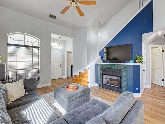 Cozy fireplaceOpen floor planHigh ceilingsPrivate fenced yardPaved drivewayCovered patioMultiple ceiling fans