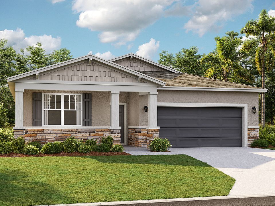 Experience the perfect fusion of contemporary design and everyday practicality in the Juniper. This home is thoughtfully designed to meet modern style standards and all your living needs, from its spacious two-car garage to a cozy outdoor lanai. At the front of the home, three main-level bedrooms offer comfort and convenience, with easy access to a dual-vanity bathroom and a walk-in laundry room just across the hall. Journey further inside to discover the open-concept kitchen and dining area-an ideal gathering spot for family dinners or festive holiday feasts. After your meal, unwind with good company in the expansive 17x17 family room. A selected option in this home is a covered lanai. Photos are from a similar home.