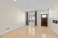 Private patio retreatSun-filled spacesJuliet balconySliding glass doorsFlexible space for guestsBold accent wallpaperHardwood flooring