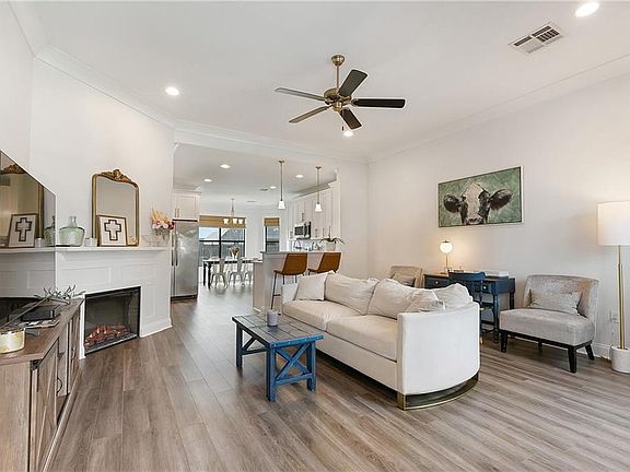 This 4 yr old home built by Barrios Builders has an open floorplan with 3 bedrooms and 2 full bathrooms!! There is an electric fireplace and exposed wooden beam in the living area that leads into the kitchen, which has stainless steel appliances, a built-in coffee bar, walk-in pantry with electrical outlets, and a ceramic subway backsplash. There is recessed LED lighting, quartz countertops, waterproof vinyl flooring, and custom window treatments throughout the home. The master bath offers a separate shower and tub. All closets are custom built with wooden shelving. The garage has a nook large enough for an extra freezer along with a smart garage door opener that you can control from your phone.