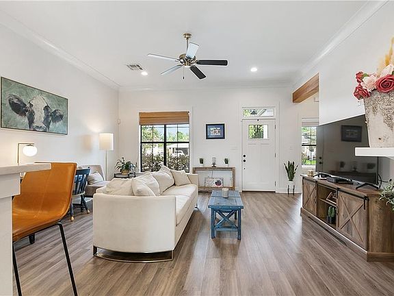 The perimeter of the home has rounded gutters. The backyard has a covered patio and features a fully fenced in backyard. Front and back patio ceilings are painted light blue. Security system installed and Flood Zone X!