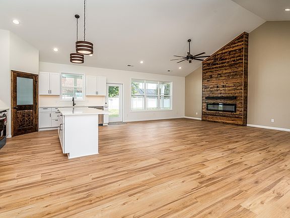 Electric fireplaceSpacious primary bedroomBig pantryOversized garageGorgeous quartz countersWood grain touchesCovered back porch