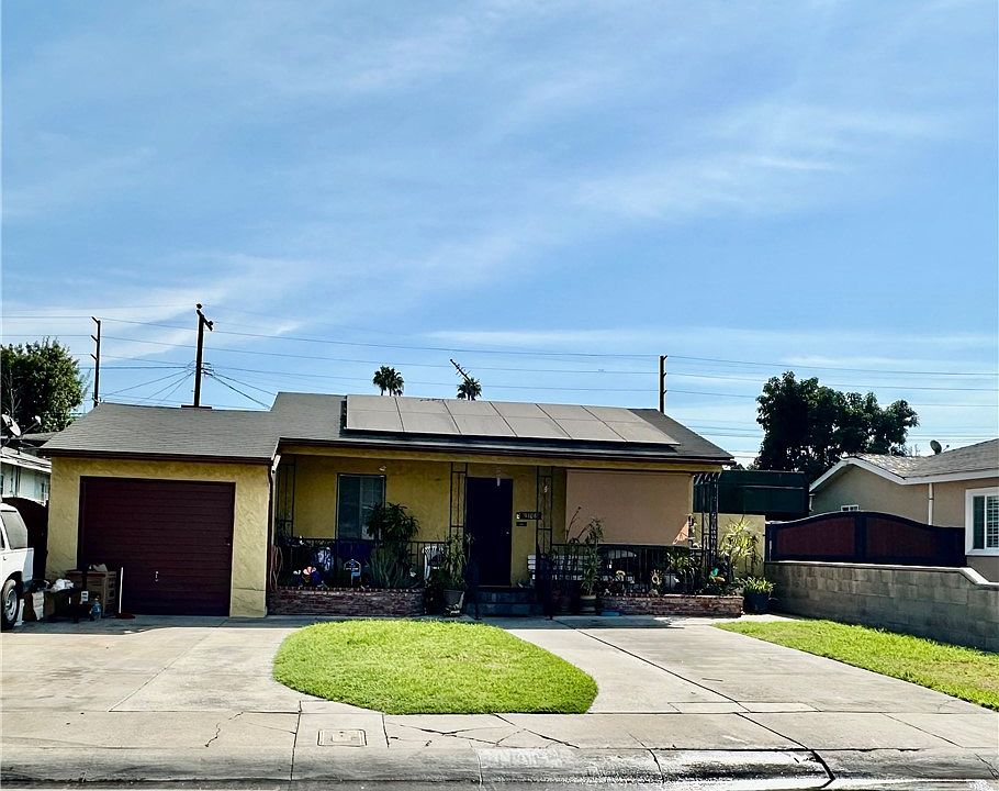 Entertain family and friends in this spacious beautiful backyard, an open patio with mature fruit trees. 3 bedrooms one updated bathroom. Light and bright living room with an adjacent dining area. Formica counter tops with tiled back splash. Plenty of cabinet space. Hallway linen closets. One car attached garage with 2 car spaces/driveway. Tiled front entry. Lovely front porch sitting area with built in planters surrounds. Newly installed 14 panels solar system. Updated electric panel.