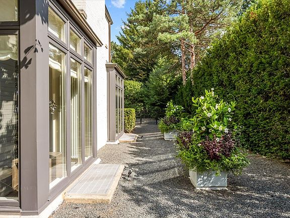 Private guest suiteFloor-to-ceiling bay windowsSpa-like bathroomMature treesLush lawnSpacious islandChic bar