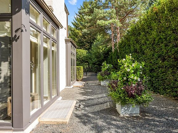 Private guest suiteHandsome fireplaceFloor-to-ceiling bay windowsSpa-like bathroomMature treesLush lawnSpacious island