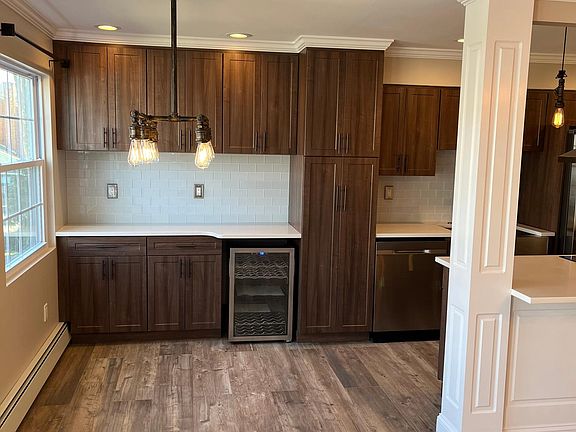 Brand new kitchen & wet bar area with wine fridge and with center island, cooktop, wall oven, granite countertops, stainless steel appliances include fridge with water and ice maker, wall oven, microwave, wine fridge, hood & farm sink.
