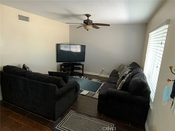 Beautifully maintained end unit featuring 2 bedrooms and 1 bathroom. This upper-level condo offers wood-like tile flooring throughout. Carpet in the bedrooms. The kitchen is upgraded with granite countertops, modern cabinetry, and a dual stainless steel sink. Dual-pane windows provide energy efficiency, and ceiling fans are installed in the dining area, living room, and both bedrooms for added comfort. The bathroom includes a tub and dual sink vanity with a granite top. Convenient in-unit laundry with washer and dryer located in a hallway closet. Enjoy a private balcony and an attached two-car garage. Located near shopping, gas stations, dining, and easy freeway access. HOA amenities include a pool, spa, and tennis courts.