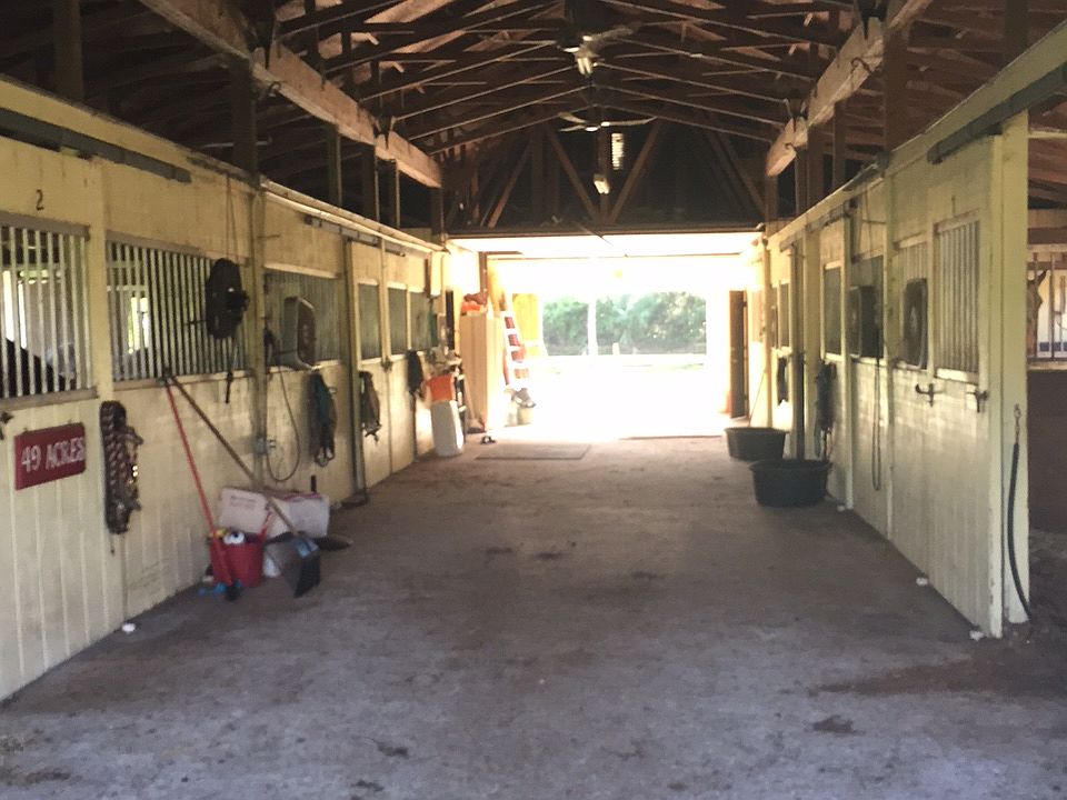 fenced, cleared with an eight stall center isle horse barn, plus 2 stall open barn. tack room and bathroom and/or would make a great property to build your own home with a place to board your own horses. Located on the corner of a paved and dirt road.