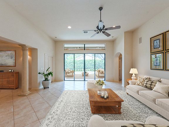 Nestled in an exclusive enclave community of just 220 homes, this beautifully maintained residence offers timeless elegance with understated Mediterranean accents and old-world charm. The home features a private backyard oasis with a large pool, tranquil fountain, pavered deck, and a retractable awning perfect for outdoor living and entertaining. Inside, enjoy spacious living areas including a great room with soaring 12-foot ceilings and surround sound (indoors and out), a formal dining room with coffered ceilings, and a split-bedroom floor plan for added privacy. The gourmet eat-in kitchen flows seamlessly into the living space, while the oversized master suite boasts coffered ceilings, two walk-in closets, and a luxurious bathroom with dual sinks and a soaking tub. Other highlights include porcelain tile set on the diagonal, a newer A/C and water heater, and pride of ownership by the original owners. Community amenities are second to none, with a newly renovated, designer clubhouse offering a resort-style pool overlooking the lake, full-time onsite management, state-of-the-art fitness center, four Har-Tru tennis courts, two pickleball courts, and an abundance of social spaces including card rooms, a billiards room, media room, arts & crafts studio, library/business center, and catering kitchen. Located just minutes from world-class golf, fine dining, theaters, and upscale shopping, Tivoli Reserve a 55+ community offers a distinctive lifestyle in a prime location.