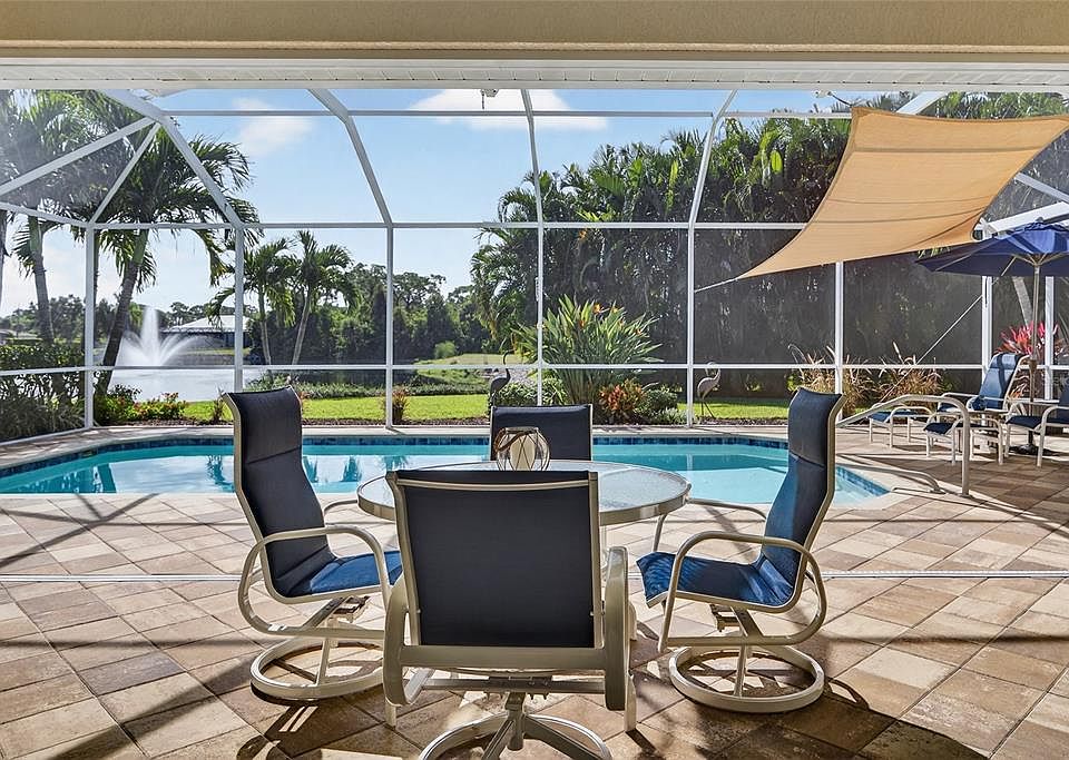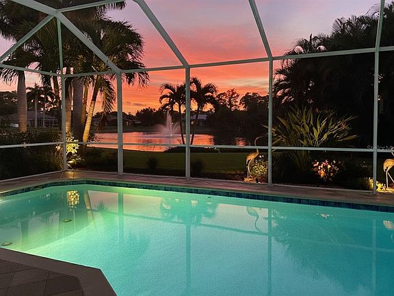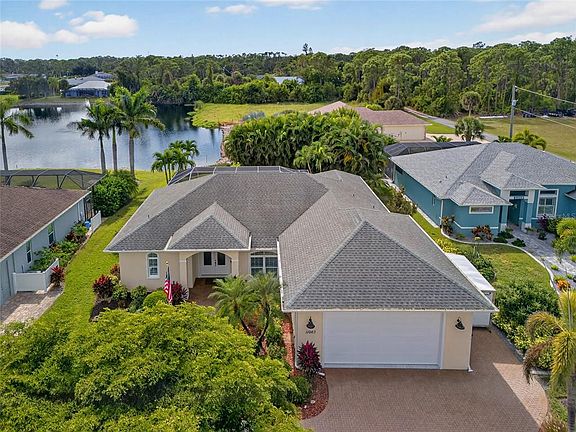 EXCEPTIONAL LAKE VIEW 3 BEDROOM, 2 BATH POOL HOME WITH RV GARAGE NEAR MANASOTA KEY! The Ultimate Florida Lifestyle Location! This stunning pool home offers more than just a residence; it offers a prime lifestyle position. Enjoy fantastic curb appeal, a circular driveway, and mature tropical landscaping. You are perfectly placed for endless fun, approximately 4 miles from Manasota Key and its pristine beaches (including Stump Pass, Blind Pass, and Englewood Beach). Plus, you're just one mile from Historic Dearborn Street for easy access to charming dining, shopping, and entertainment. Step inside to a home defined by quality and custom craftsmanship features soaring 12-foot ceilings, elegant crown molding, 8-foot interior doors, plantation shutters, and porcelain tile flooring throughout for a grand, seamless feel. The well-designed kitchen boasts 42" soft-close maple hardwood cabinets with pull-out shelving, gorgeous granite countertops, stainless steel appliances, a stone backsplash, and pendant/recessed lighting. A spacious retreat with a desirable split bedroom floor plan. The primary suite features dual walk-in closets, an insulated sound wall for quiet comfort, and an en-suite bath with quartz countertops, a comfort height toilet, a lighted make-up mirror, and a walk-in-shower with porcelain walls and stone flooring. Seamless Outdoor & Lake View Living. The true heart of this home is the outdoor oasis overlooking splendid McCall Lake. Pocket sliding doors with sun roller shades provide a continuous, effortless transition from the living area to the large screened lanai. Enjoy year-round swimming in the heated saltwater pool, which features sunshade sails overhead to provide optimal shade and comfort over the paver lanai. The space is complete with mature landscaping and a convenient outdoor shower, all set against a stunning, tranquil lake view. The attached, extra deep 3-car garage (25' wide x 32' deep) is an enthusiast's dream, featuring a 10-foot door and is large enough for an RV or boat. It boasts insulated attic, a utility sink, a workbench, an epoxy painted floor, and a dedicated mini-split A/C. The property includes an irrigation system, 12-volt LED lights and additional boat/trailer parking. Enhanced safety with Hurricane Windows and Doors throughout the home plus Ring security with cameras and 2 control panels. This home is perfectly positioned for both fun and luxury year-round! Schedule your private showing to experience this lovely home for yourself!