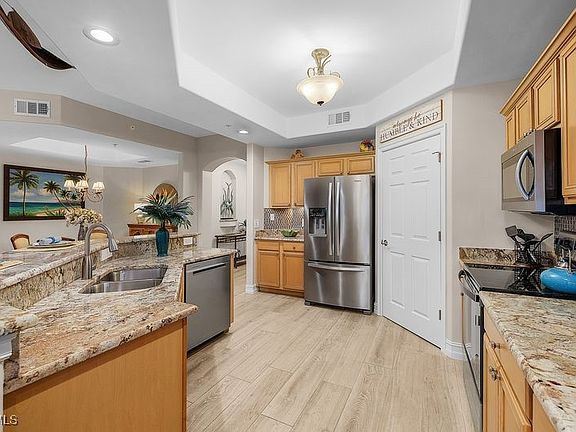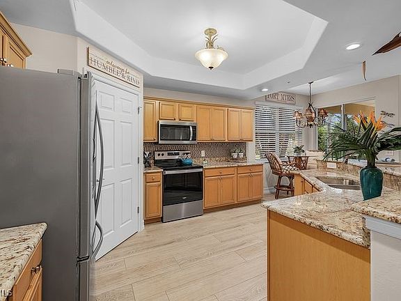 Wrap-around lanaiGranite countersEntry foyer tray ceilingArched doorwaysWood cabinetsFormal diningTray ceiling