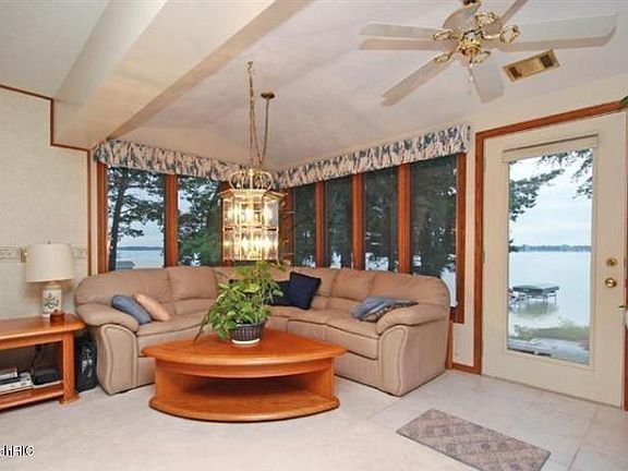 This house is tucked away on a private road in one of the most desired areas of Gun Lake. It boasts a sandy beach and swimming area and the view is great. At the shoreline there is a boathouse to store all your lake toys and even the dock which is included. On top of the boathouse is a deck, perfect for sunning and lake watching. The landscaped front yard is terraced and features a patio with gas firepit. The house offers a large open great room with gas fireplace and tall windows for viewing t he lake. The updated kitchen has a snack bar and an eating area with skylight and more windows to capture views of the lake. The two car garage has a finished interior and also has a full basement. With 50ft of some of the best waterfront on the lake, you need to come check this terrific property.