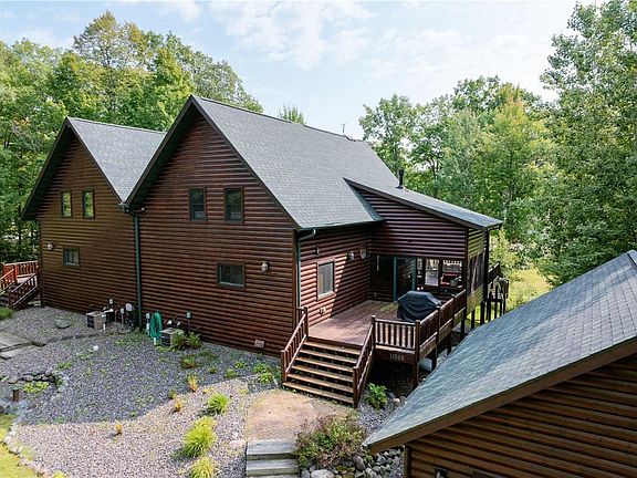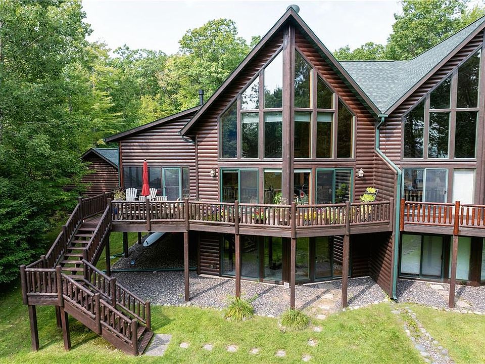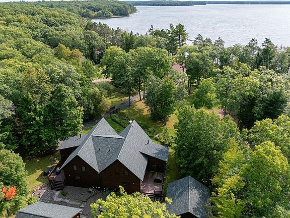 Discover lake living on prestigious Round Lake near Hayward, WI in this condominium home blending rustic charm with modern comfort. The exterior boasts log siding, dramatic roof lines, expansive lakeside glass, a deck, and a spacious screen porch. Inside, knotty pine accents, two fieldstone fireplaces, and a refreshed kitchen create a warm cabin feel. The main floor hosts the primary bedroom and laundry for convenience. A walkout lower level features a family room, generous second bedroom, bath, and lake views, while a loft adds flexible space for sleeping or office needs plus a third bath. A 2-car detached garage is included. Shared frontage provides a private boat slip, giving direct access to one of the Northland?s most coveted lakes. Trails nearby offer year-round outdoor pursuits, making this property an ideal retreat for lake enthusiasts.