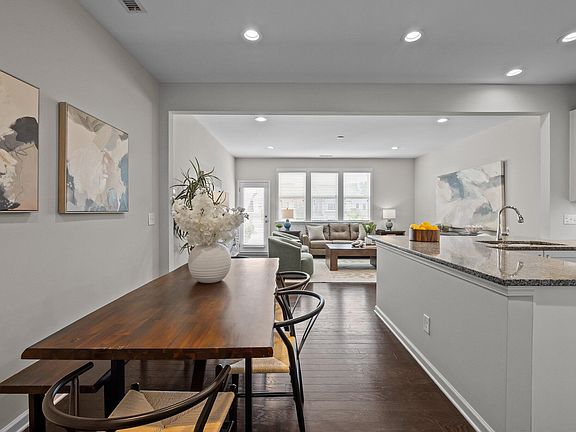 Welcome to easy, modern living in this beautifully maintained Ellis Crossing townhome featuring 3 spacious bedrooms and 2.5 baths. Designed with an open-concept layout, the home offers the perfect flow for entertaining and everyday living. The main floor showcases elegant engineered hardwoods, 9-foot ceilings (also on the second level), and recessed lighting that brightens the space throughout. The chic kitchen boasts granite countertops, a gas range, tile backsplash, stainless steel appliances, and crisp white cabinetry—blending both style and function seamlessly. Tucked at the rear of the home, the serene primary suite overlooks green space and features a spa-like ensuite with a soaking tub, walk-in tiled shower, dual vanities, and a spacious walk-in closet. Two additional bedrooms offer generous space and share a well-appointed hall bath Upstairs, a versatile loft provides the ideal spot for a home office, reading nook, or play area. Recent upgrades include fresh paint and new carpet. Enjoy the outdoors with a private rear patio and the convenience of a 1-car garage. Minute to groceries , dining and major highways. This is effortless living at its best—don't miss the chance to call it home!