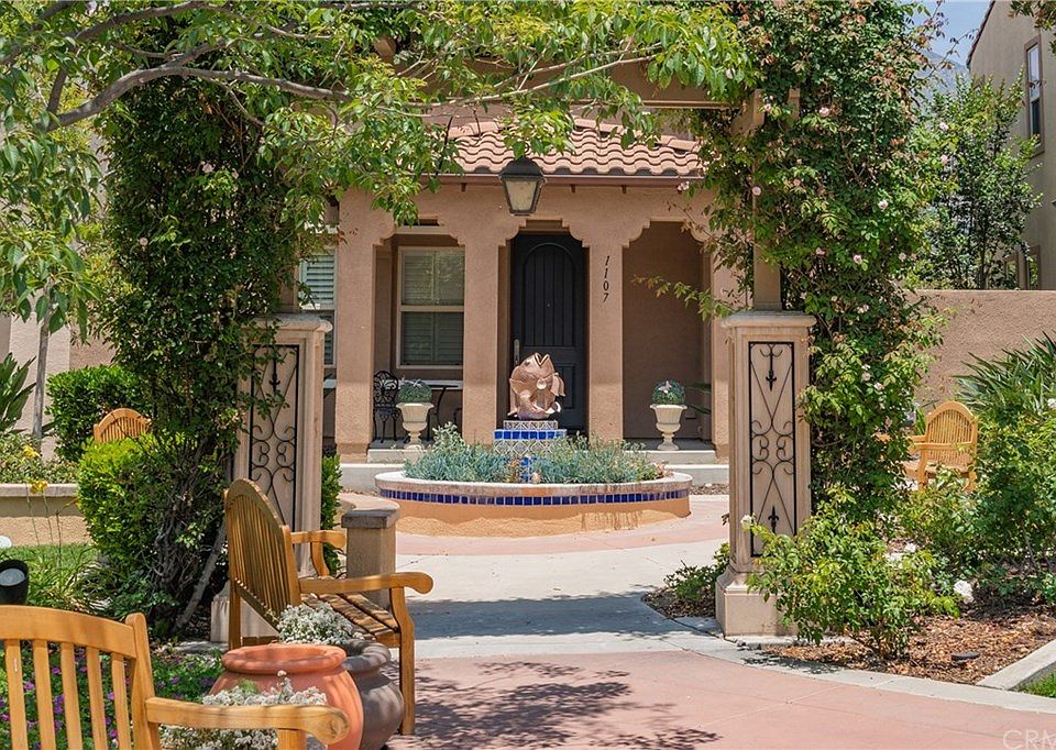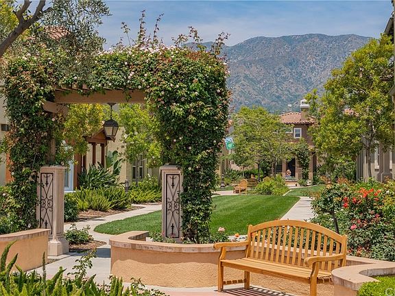 This Mediterranean inspired two story house sits in the Duarte Huntington Courts right below the scenic San Gabriel mountains. The covered front porch, complete with green teak benches, leads to a cozy living room that opens to the dining room, complete with recessed lighting, word floors, and a fireplace. Crown molding and plantation shutters complement that stainless steel appliances, custom built cabinets, and the granite countertop that adorn the kitchen. The master bedroom features a double sink as well as its own granite countertop and travertine tiles. This unit has the largest lot in the community complete with a private walk path to a two car garage. Since the unit is close to the 210 and 605 freeways, dining and shopping are always varied and convenient. You will love this gem!