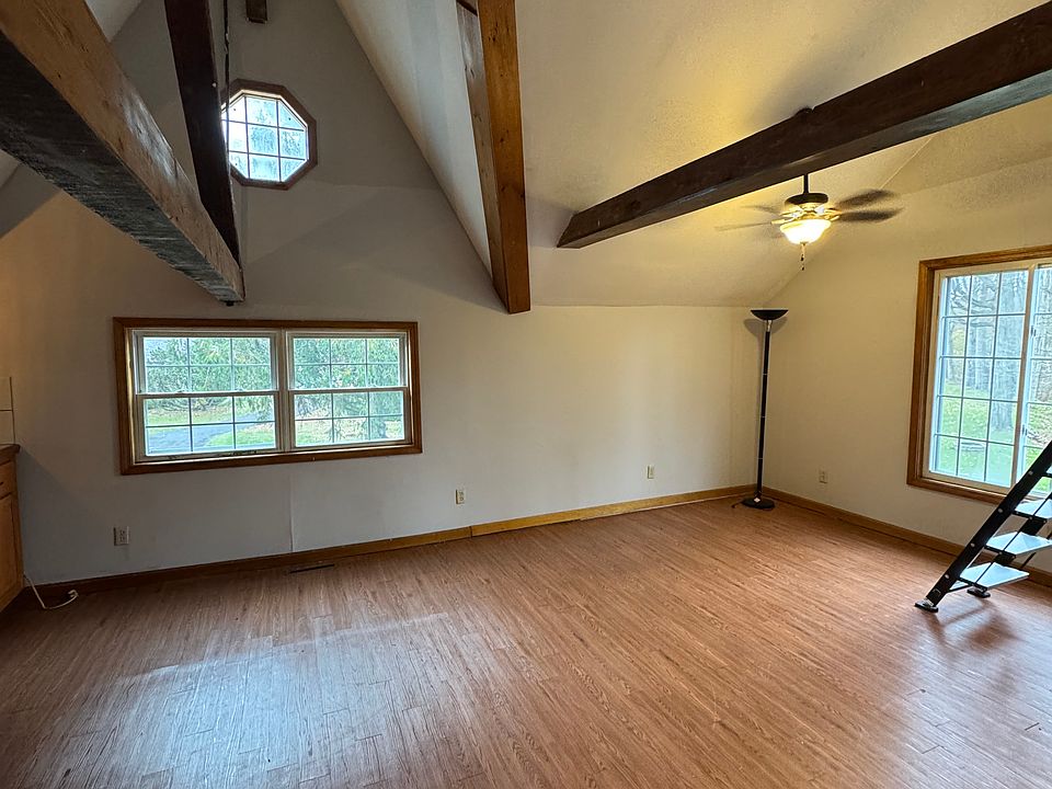 The apartment offers an open-concept living area with a spacious kitchen and living room, two bedrooms, a large bathroom, and a versatile bonus room. A modern iron ladder leads to a cozy loft, and rustic wood beams throughout add warmth and character to the space.