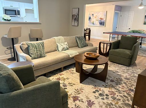 Relax in the bright and open living room featuring a smart TV, comfortable seating, and fast Wi-Fi throughout the home. The home also includes a dedicated workspace for remote work or virtual meetings, along with a washer and dryer for added convenience during your stays.