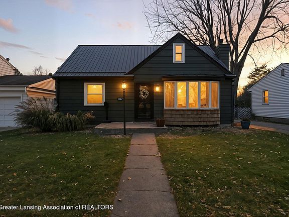 Delightful three bed, two full bath, modernized Cape Cod ideally situated in the sought after Groesbeck neighborhood. This centrally located area is close to Eastwood, Frandor, US 127, and the perfect tree lined community bridging Lansing and East Lansing. A spacious and light filled living room features an inviting brick hearth gas fireplace to warm winter's cold nights. Enjoy an updated skylighted kitchen with quartz counters, newer stainless appliances and ceramic tiled floors. The chef is always part of the action with a kitchen that opens to a sunken dining room and adjacent hardwood floored family room surrounded by windows -all overlooking a composite deck and private fenced yard. Two nicely sized bedrooms and designer inspired bath complete the main floor. The upper level is the perfect retreat for the primary bedroom suite with striking ultra modern fully tiled bath. Tons of storage too. And when you're ready add your finishing touches to the newly carpeted 11x31 ft rec room/hobby/man cave! Hayford updates include: kitchen remodel, newer appliances, completely finished upper level with a full bath, new metal roof, carpeting, composite porch and deck, Ayers basement system (transferable) and glass block basement windows.