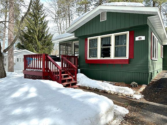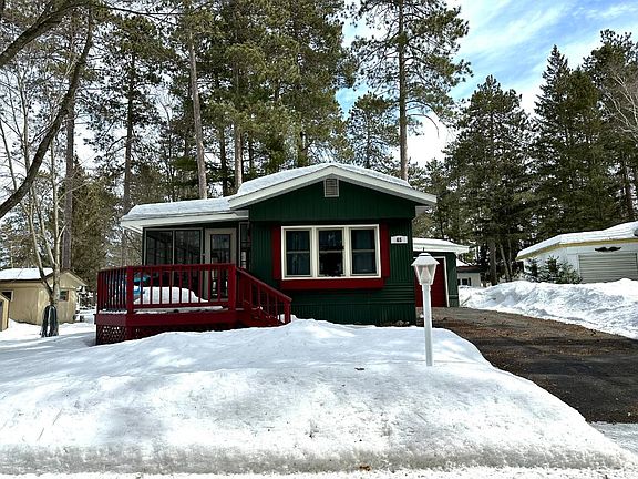 Check out this beautiful 2 bedroom, 1 bathroom home in Lakeland Village's 55 and over community, on 718 acre Shishebogama Lake! This home has interior custom shiplap panelling, a landscaped yard with an outside deck, a unique barn door to the guest bedroom and a 3 season living room! Some furniture included and the rest is negotiable! Close to downtown Minocqua for restaurants and shopping, access to the Gunlock Chain, and only 2 minutes out the front door to the water! The village has a rec center, laundry, fire pit and takes care of all amenities with the $625 monthly lot rent. Also included in that is cable, lawn care, trash, sewer, and water. Conveniently located close to the Village entrance!