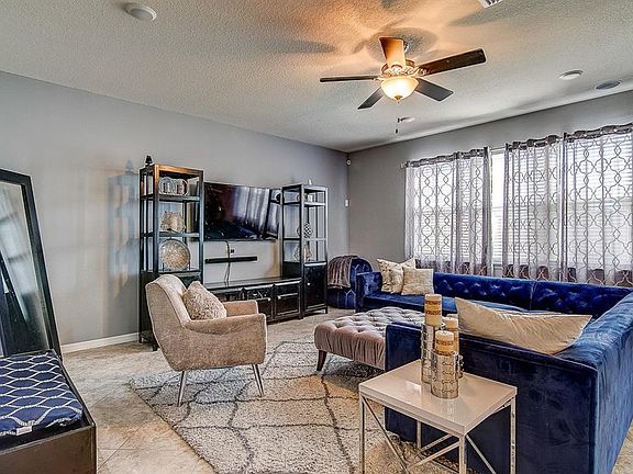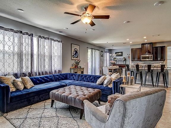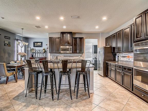Fabulous, large home with tons of upgrades to include, but not limited to, upgraded gourmet kitchen featuring 42" cabinets, stone backsplash, granite counters, stainless appliances and double ovens. Open floor plan is great for entertaining with ceiling fans, surround sound and tile. It also opens to the upgraded covered lanai for convenient outdoor grilling and fun. Downstairs has upgraded 20" tile throughout except in the upgraded mother-in-law suite with private bath. Beautiful wrought iron railings lead upstairs to the additional 4 bedrooms and large open loft which works great a play room or family movie area. All bathrooms have quartz counters and the master bath has upgraded tile, dual sinks and a separate garden tub and walk in shower. Beautiful master bedroom retreat with luxury bathroom. The second and third bedrooms are also generous sizes. Outside features a corner lot and fully fenced back yard. Upgraded lot location places the home in the perfect location across the street from the community park/playground. The neighborhood also features and amazing clubhouse, fitness center and community pool with a fun zone waterpark.