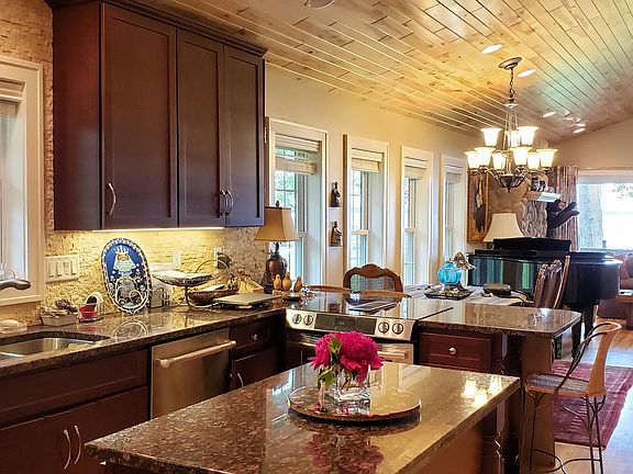 LAKE . MELISSA!! Level sandy shore on Dakota Beach with PERFECT year round 2 bedroom, 2 bath home and darling remodeled bunkhouse with half bath. Covered lakeside deck extends the entertaining, cozy fireplace, granite counters, Cherry cabinets, Hickory floors and ceilings, Trex decking, UGSS and 20x24 heated garage with built-ins. Cute curb appeal and pristine beach.