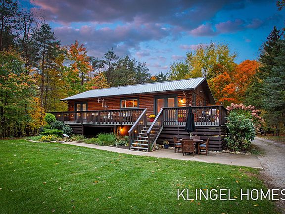 Welcome to 11078 Walnut Dr, Nunica! Discover rustic charm and modern comfort in this beautifully remodeled log home nestled on over 3 acres in Nunica, MI. BONUS this home is situated in the SPRING LAKE SCHOOL DISTRICT. Surrounded by peaceful countryside views, this home perfectly blends warmth, character, and functionality. The main level features an inviting open-concept layout highlighted by stunning wood details, a beautiful kitchen with newly installed countertops and stainless steel appliances, a cozy living area that features a wood stove, and a spacious primary bedroom suite for convenient main-floor living. The fully finished lower level presents a recreation area and a door leading to the walkout patio space along with a pellet stove. Also on the lower level are two additional bedrooms, full bathroom and functional storage space. Outside has been meticulously maintained with a freshly stained exterior. Enjoy the expansive yard and a detached 4-stall garage complete with an upper loft ideal for storage, a workshop, or a future guest space along with a fenced in garden with blueberries, raspberries, and strawberries along with fruit trees including cherry, apple, pear and peach! Experience the perfect mix of privacy and convenience with easy access to nearby towns, highways, and outdoor recreation. Your log home retreat awaits in Nunica! Call us today to schedule your private showing!
