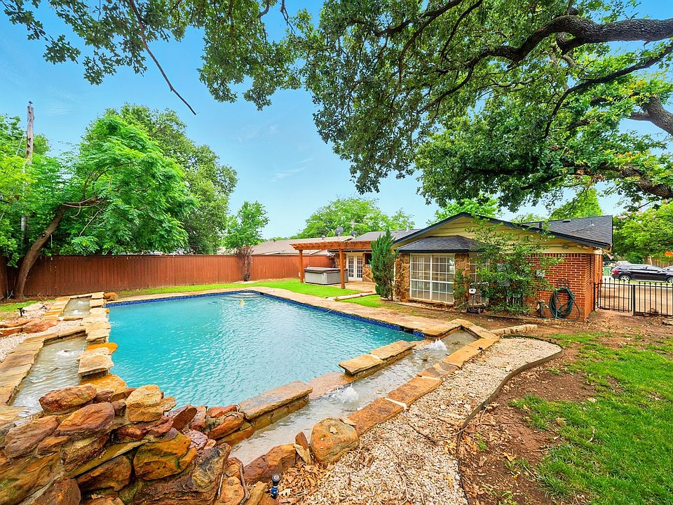 • Backyard oasis with pool, hot tub, pergola & water feature