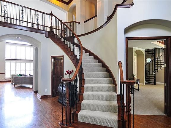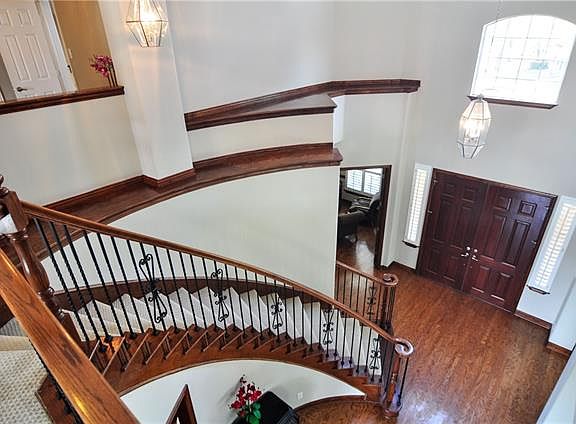 Stunning brick & stone showplace in gated golf community. Wood floors, plantation shutters & new carpet. Dramatic grand foyer has winding wrought iron staircase. Formal living & dining ideal for entertaining. 2 story great room w stone FP is open to gourmet island kitchen w SS appl & gas cooktop. Study w French doors. Awesome main level master w spiral staircase to private library. 3 bedrooms, game & media room up. Fenced yard & oversized garage.