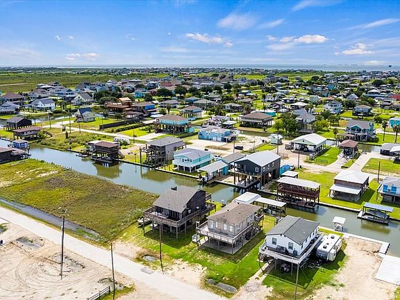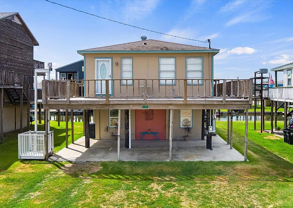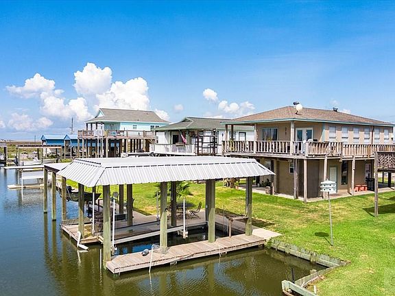 This is truly a fisherman's DREAM house in the sought-after Blue Water Subdivision! Not just one, but two boat houses with boat lifts on a canal that is a short ride to the ICW and East Galveston Bay. This two-bedroom one bath home was recently updated with a new interior and central air conditioning. There is a wonderful covered deck and a walkway around the house plus a cargo lift for your heavy lifting. The downstairs area has plenty of great storage. The dinette table and chairs, barstools, and white storage cabinet in the kitchen will stay with the house. The fridge and outdoor furniture will also stay. The window units will remain in the house but are no longer needed with the central air system.