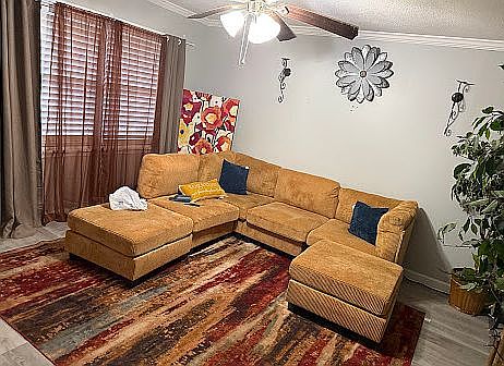 The home features three spacious bedrooms, each with ceiling fans for added comfort. The master suite includes a private bathroom and his-and-hers closets, while a hall bathroom serves the additional bedrooms. The bonus room, complete with laundry connections, adds versatility to the space.
