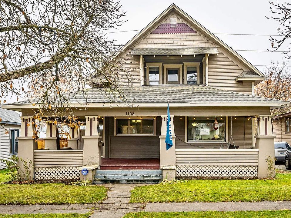 Gonzaga Grandeur in this remarkable 2848 sq ft Bungalow-style home! All the romance of the era, this home features a wrap-around cover front porch and a 2nd level covered balcony-style porch, beautiful woodwork w/wood columns, open-rail stair balustrade, five-panel doors, leaded glass windows, and hardwood floors. Main fl Great Room offers a spacious area for large gatherings, yet cozy enough for one or a few, and has a gas fireplace too. Adjoining Den with wonderful french doors could also be easily converted to a Main Floor Master Bathroom for a total of 4 bedrooms. Tasteful remodeling includes updates to the Kitchen, Bathrooms, and most all other areas of the home. The 2nd level is also spacious with tall ceilings, 3 large bedrooms, dbl walk-in closets, full bathroom, and a Laundry Room. Enjoy outdoor living in the private fenced backyard that includes flower boxes and a fire-pit w/built-in seating. Park your vehicles in the one-car or two-car garages and/or use them as a Shop or Studio.
