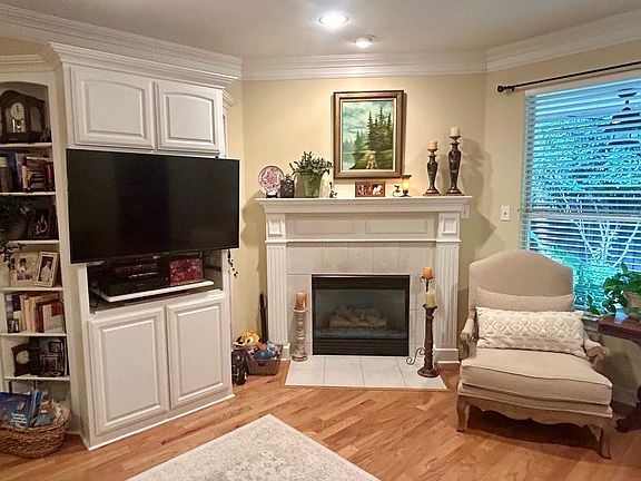 Garden Home in gated community!One of a Kind neighborhood-Lovely brick-stone home with landscaped front yard has mature trees and very nice landscaping and the back patio area is completely landscaped and requires very little maintenance and feels completely private. Nice covered back porch with fountain provides tranquility and open space for a grill and sheltered seating. Beautiful crown molding, wood floors throughout entry and living and matching luxury vinyl plank in kitchen and dining area. Living room has gas fireplace and built in cabinetry for TV and storage and great views out the walls of windows to the back yard. Large open Kitchen with white cabinetry is light and bright and includes built in pantry pull outs in the middle for easy access-lots of room to move around in this kitchen with extra storage including lazy susans, instant hot water system installed below kitchen sink. This spacious kitchen is open to Large Dining area has ample room for a large china on outside wall and once again the wall of windows brings in the light to this open kitchen. Primary bedroom is spacious flowing into bath with double sinks, jetted soaker tub, and separate shower and WC with built-ins. The walk-in closet includes storage shelves, custom built in drawers and generous hanging space. Entire home has hard surface flooring. Two additional bedrooms are separated from the primary bedroom wing and a full bathroom with tub-shower combo. One bedroom is currently used as a study and has a large closet for extra storage. The other bedroom has a huge walk in closet similar to Primary closet so no lack of storage in this great home. Laundry-study bedroom hallway also has a wall of storage cabinets floor to ceiling for tons of storage and laundry room specific has built-ins and storage for hanging and shelving.