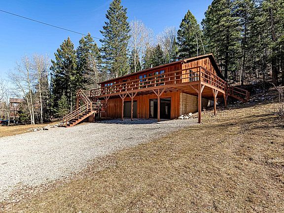 Nestled amongst the pine, fir, and aspen trees this custom home is close to all the amenities of Cloudcroft & sitting on 6 lots (appx 0.9 acres) you gain the added space & privacy that is a rare find w/n the village limits. The 1,980 sq ft (m/l) home, offers open concept living room/kitchen w/ multiple large windows allowing for an abundance of natural light. Feel the classic mountain cabin vibe w/ an open flow from the generously sized kitchen into the living room. A centrally located wood stove is perfect for cozy winter evenings. 2 bedrooms & 1 bath upstairs. Downstairs is a 2nd bathroom, 1 bedroom & a bonus room that could serve as an additional sleeping area, office, or hobby room. 2-car oversized garage allows space for vehicles plus storage. Plenty of extra parking/RV parking on the property due to the added lots. The wrap around redwood deck is superb for entertaining or to relax and watch the wildlife that regularly visit the neighborhood. Call to schedule your private tour!
