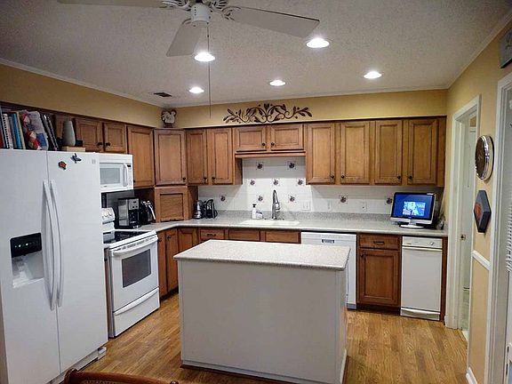 This home is well maintained and move in ready. Open living area with vaulted ceilings and stone fireplace. The kitchen has island with additional storage and breakfast area overlooking the backyard. Just off the kitchen is a formal dining room. Large master bedroom suite with spacious bathroom offering his/her vanities and walk-in shower. Yard has mature oak trees, covered patio and backyard deck for relaxing or entertaining. Great location in Bel Air Subdivision. New HVAC system and storage building. Close to shopping, entertainment and hospital.